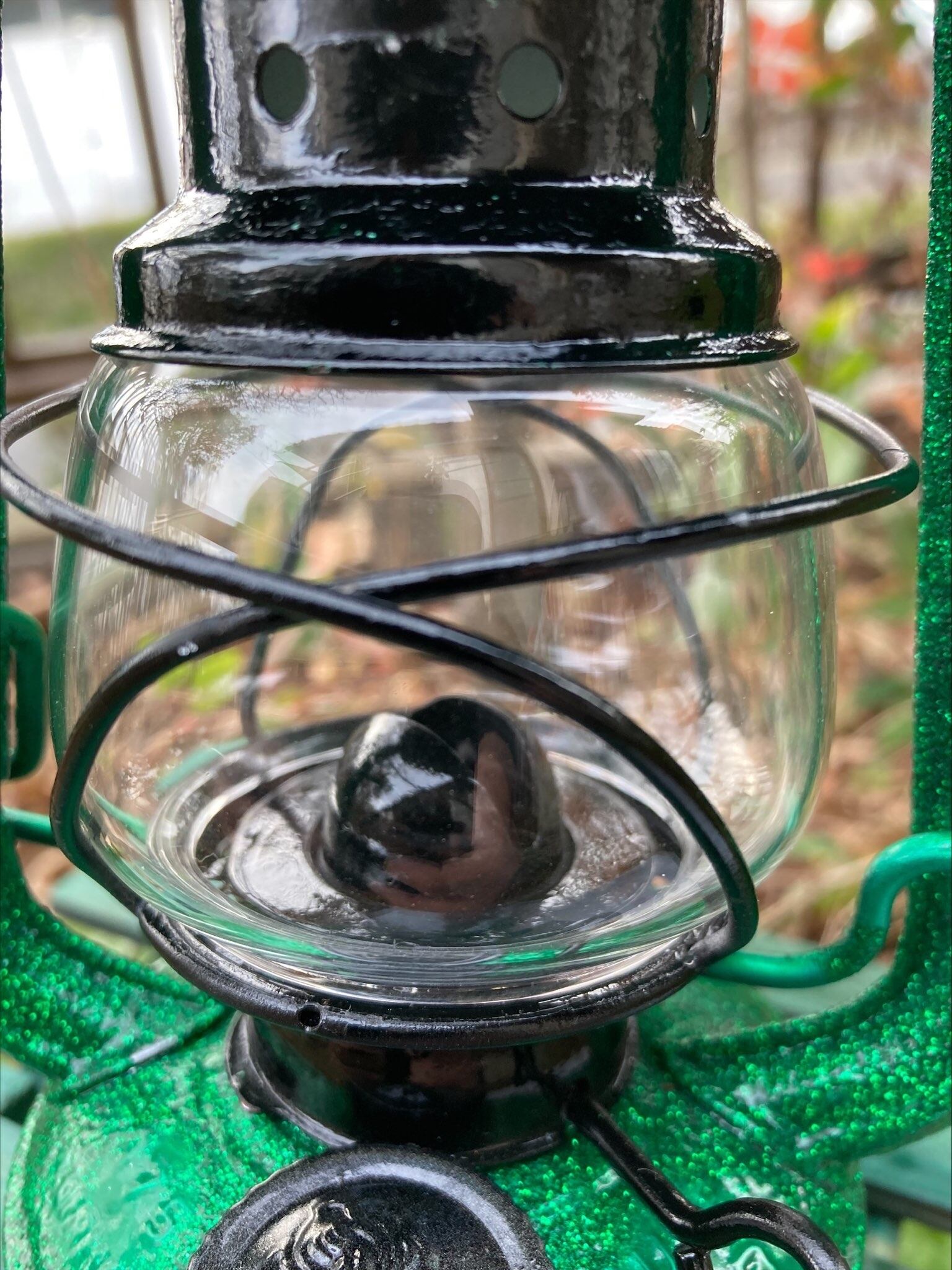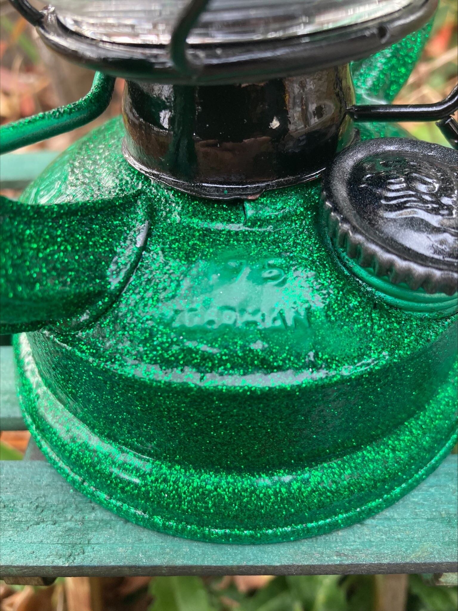 サビだらけのランタンを丁寧にケレンをしてグリーンにリペイントし・グリーンラメを吹き付けました。