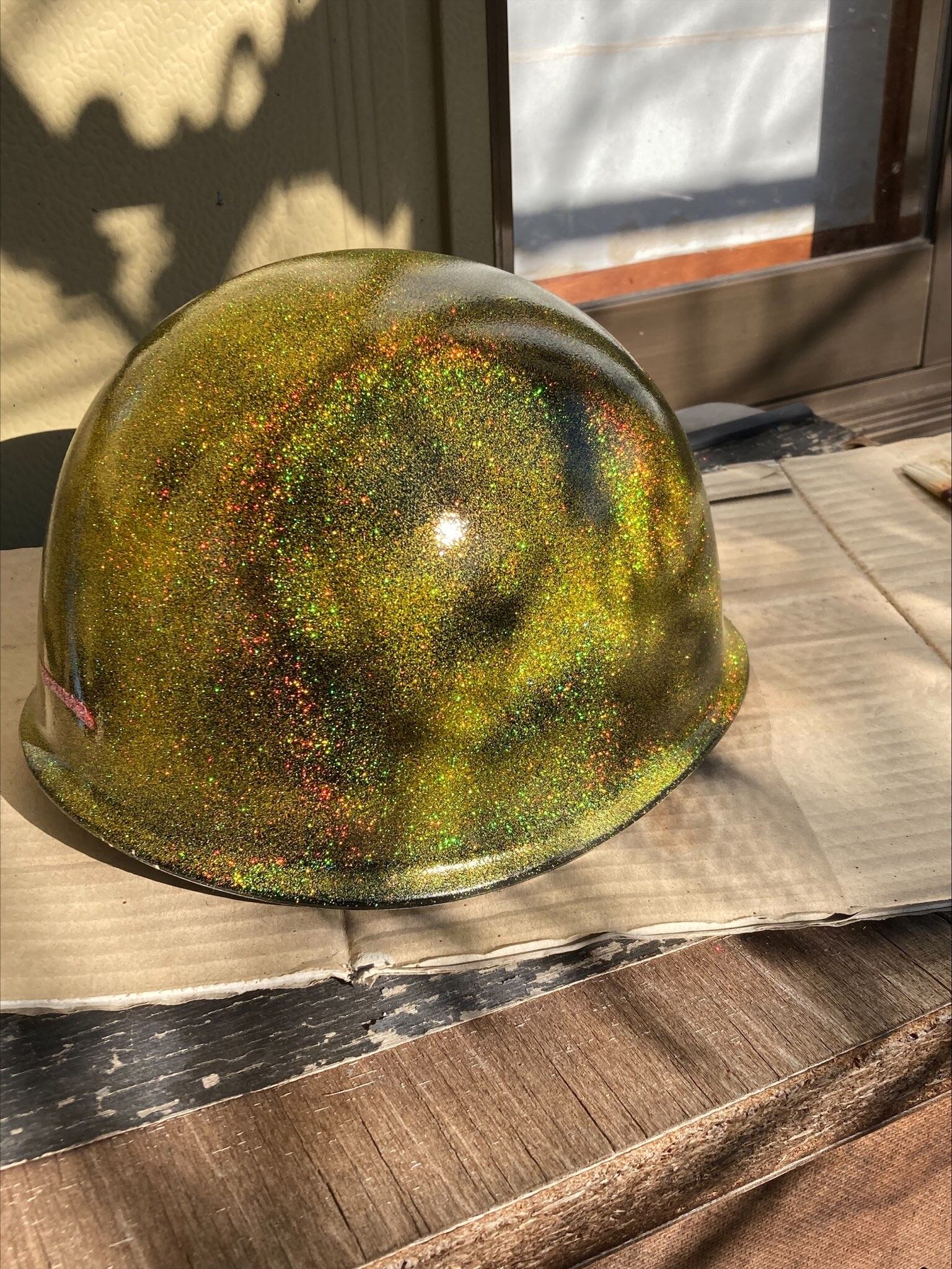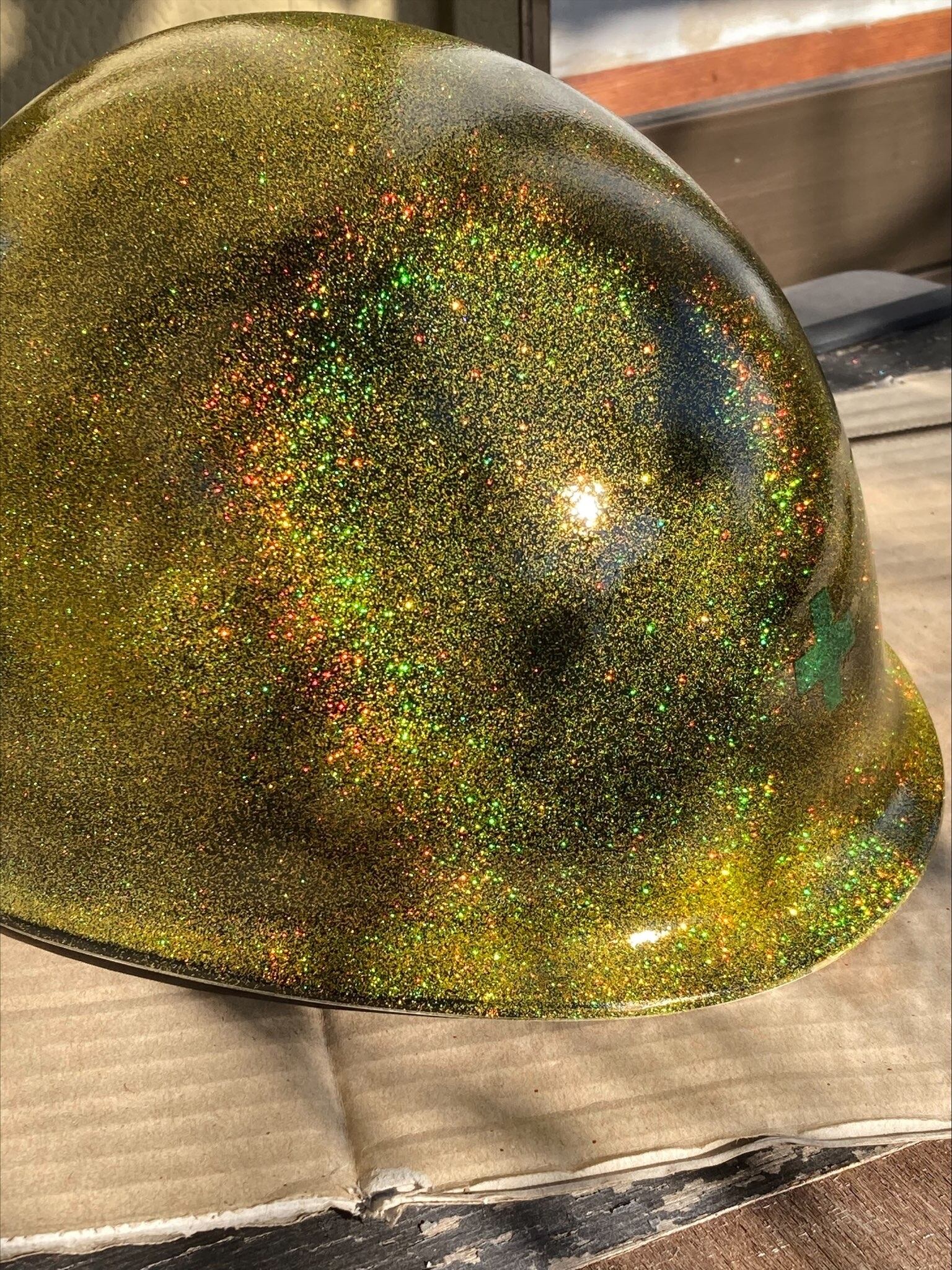 現場用、防災用ヘルメットです。黒ベースにゴールドレインボーラメを吹き付けました。トップコートも、6層吹き付けてるので、とても輝いてます。直ぐに貴方と気付くでしょう 笑