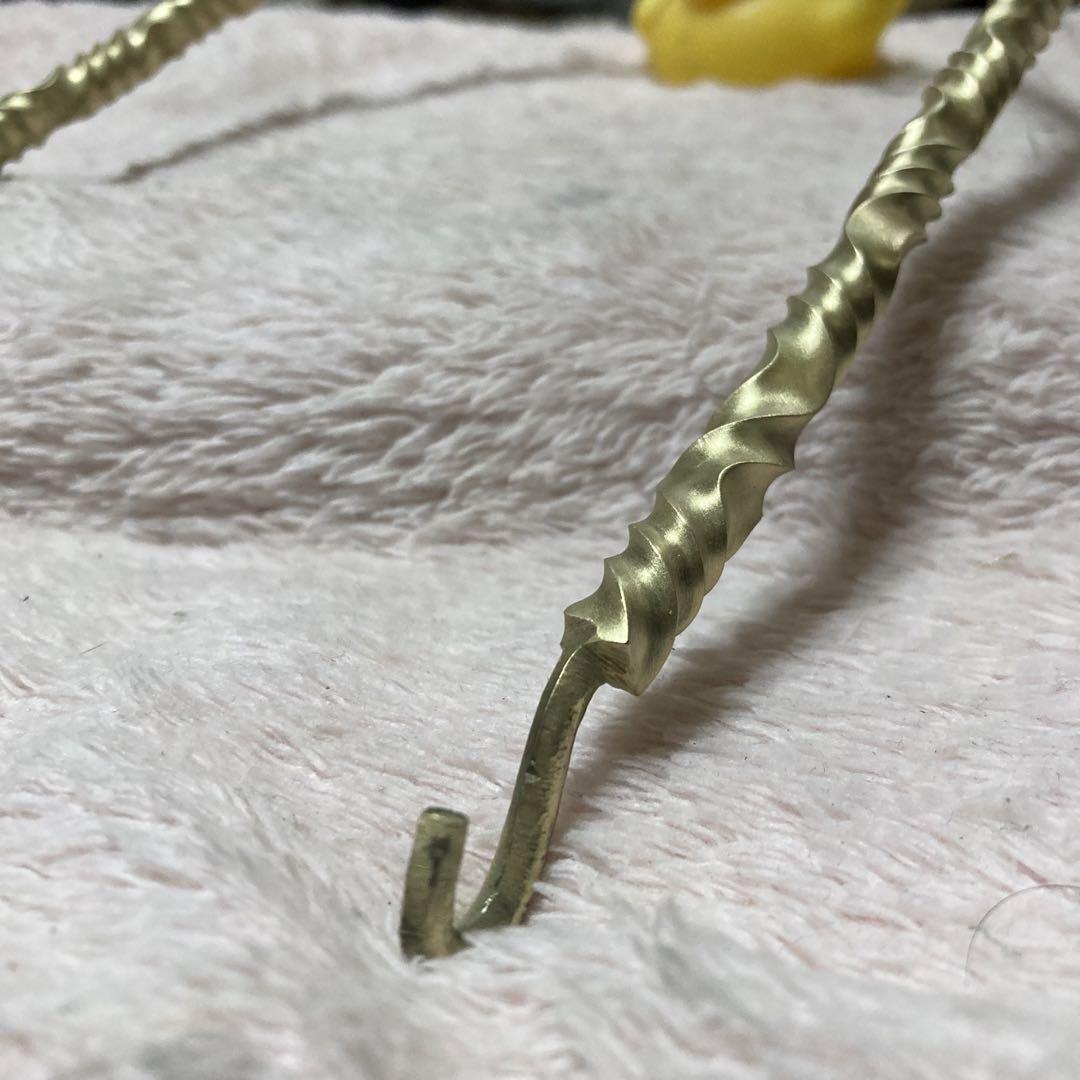 6ミリ真鍮をねじって仕上げました。新品ですが加工、ねじる時に出来た傷や磨き残しがあります。あくまでもハンドメイド品ですので、完璧なものを求める方は他でご購入ください。ハンドメイドに理解のある方のご購入をお待ちしております。