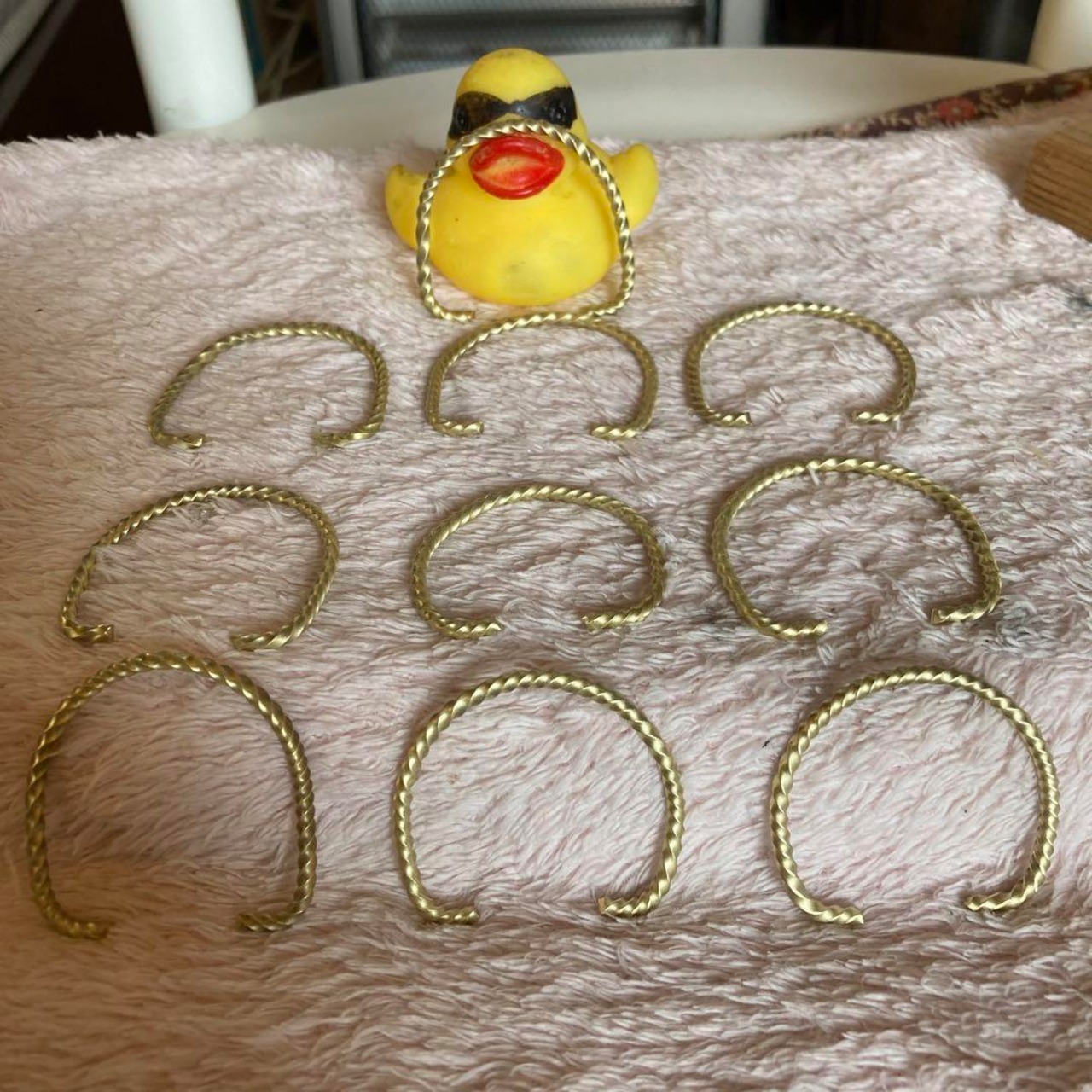 2ミリ真鍮をねじって仕上げました。新品ですが加工、ねじる時に出来た傷や磨き残しがあります。あくまでもハンドメイド品ですので、完璧なものを求める方は他でご購入ください。ハンドメイドに理解のある方のご購入をお待ちしております。